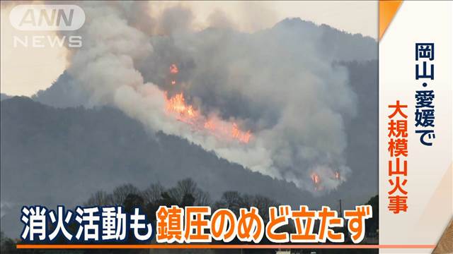 各地で発生している山火事は鎮圧のメドが立たず、今も延焼を続けています。愛媛県今治市では延焼エリアの拡大を受けて、避難指示が出ていない地域の住民も、避難の準備を始めています。26日も、止まらない被害の拡大。煙が立ち上るその下では、火の手が広がり続けています。4日目となった愛媛県今治市の山火事。26日午後2時半時点には、約417ヘクタールが焼けたということです。25日夕方には…。「山火事の延焼でしょうか。住宅からものすごい勢いで炎が上がっています」山から住宅地へ“飛び火”。26日午後2時半の時点で、住宅などの被害は9棟にのぼっています。そして今治市の山火事で“異例の規模”となっているのが、避難指示です。現在、隣接する西条市とあわせて7494人に避難指示が出ていますが、これは、今月9日に鎮圧した岩手県大船渡市の山林火災と比べて、約1.6倍の規模となっています。また、四国電力は延焼が続いた場合、今治市の全域にあたる7万6000戸が停電する可能性があるとしています。https://news.yahoo.co.jp/articles/5febfd46e2d31ea19411cf111728a7f5a1967957