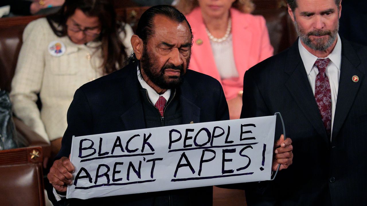 トランプ氏一般教書演説、民主党議員が「黒人は猿じゃない!」プラカード掲げ退場 写真3枚 国際ニュース:AFPBB News2026年2月25日 12:46発信地:ワシントン/米国 [ 米国 北米 ]米議会の上下両院合同会議の議場で、ドナルド・トランプ米大統領が一般教書演説を行う中、「黒人は猿じゃない!」と書かれたプラカードを手に退場させられるテキサス州選出のアル・グリーン下院議員(2026年2月24日撮影)。(c)ANDREW CABALLERO-REYNOLDS/AFP【2月25日 AFP】24日のドナルド・トランプ米大統領の一般教書演説中、民主党議員が「黒人は猿じゃない!」と書かれたプラカードを掲げ、議場の外に退去させられた。プラカードは、トランプ氏のソーシャルメディアアカウントに投稿されたバラク・オバマ元大統領とその妻ミシェル・オバマ夫人を猿に見立てた人種差別的な動画に言及したものだった。トランプ氏のSNS「トゥルース・ソーシャル」アカウントに今月投稿され、後に削除された動画は米国発の黒人大統領であるオバマ氏と妻のミシェル氏を猿に見立てたもので、党派を問わず激しい怒りを引き起こした。テキサス州選出のベテラン下院議員アル・グリーン氏は、トランプ氏が米議会の上下両院合同会議で一般教書演説をするため会場入りした際、立ち上がって抗議のプラカードを掲げた。すると、群衆の中にいた何者かがグリーン氏からプラカードを奪おうとした。黒人のグリーン氏は、トランプ氏がゴールデンタイムの一般教書演説を始めようとしてもプラカードを掲げ続けた。だが、最終的に「USA! USA! USA!」というコールの中、議場から退去させられた。(略)※全文はソースで